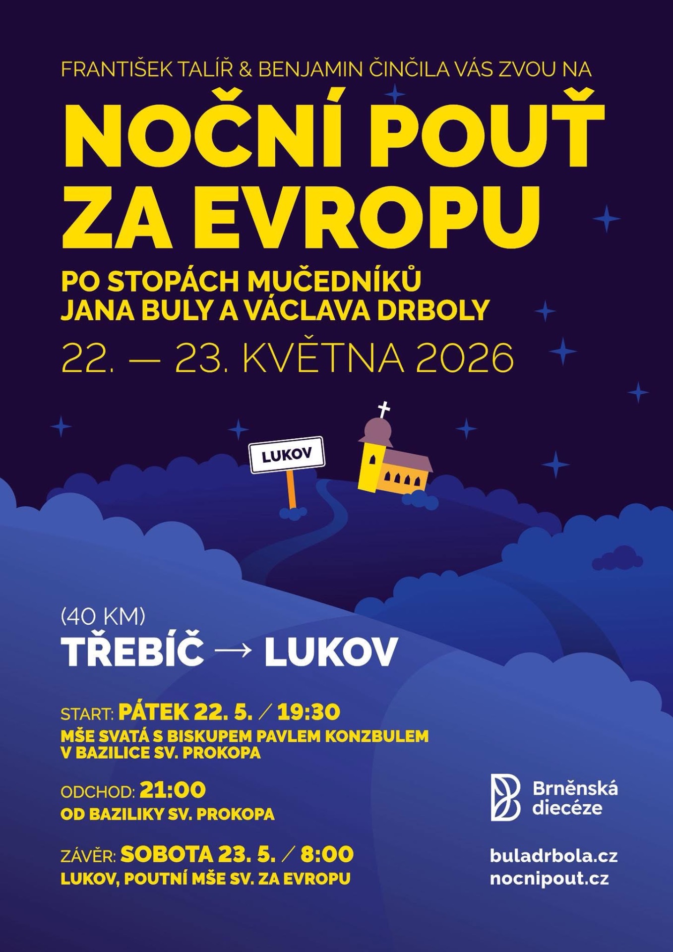 Sestry, bratři a přátelé,Sestry a bratři,spolu s Benjamin Činčila vás srdečně zveme na třetí NOČNÍ POUŤ ZA EVROPU ┃ Třebíč ⮕ Lukov - tentokrát ve stopách mučedníků Jana Buly a Václava Drboly 🙏Pokud by bylo samotné putování nad vaše síly, budeme moc rádi, když se připojíte na úvodní nebo závěrečnou mši svatou, viz plakátek. Všechny informace najdete na webu: nocnipout.czTěšíme se na vás a moc děkujeme za pomoc s organizací Lucie Lukšů, Marie Dudíková a všem místním lidovcům!František Talíř